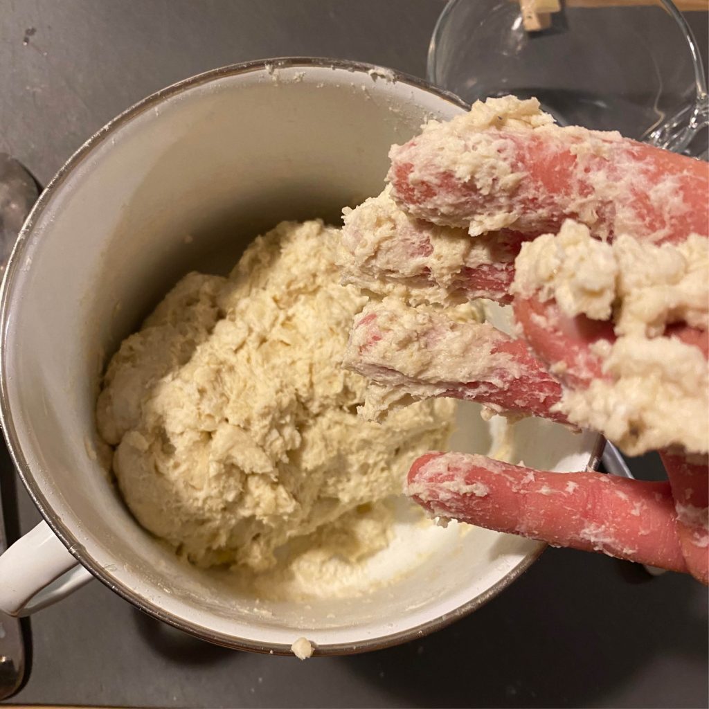 3. Z uwagi na to, że ciasto jest lepkie, posypuj ręce, blat i wałek mąką. Niestety z tym jest najwięcej roboty i tak, też się wkurzałam, ale uwierz, warto naprzeklinać. 😀 Z ciasta uformuj małe kulki, delikatnie posypując mąką.