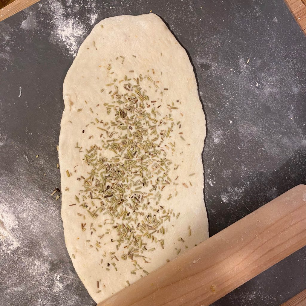 4. Jeżeli chcesz przygotować chlebki smakowe, to jedną stronę ciasta posyp wybranymi przyprawami. Całość przejedź wałkiem, aby wszystko „weszło” w ciasto.